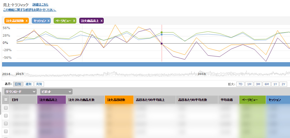 売上・トラフィック詳細ページに関する情報を日・週・月単位で表示
