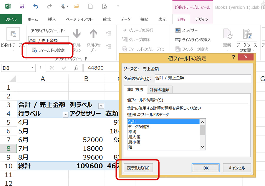 ちなみに、上の写真のように月ごとの売上をチェックしたい場合は、日付の部分で右クリックして、「グループ化」をクリック、単位を月にします