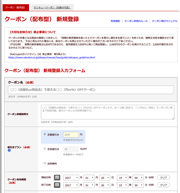 ここで制限を入れます。50%OFFなど通常の店舗様はできないので5名や10名限定のクーポンを作成します。