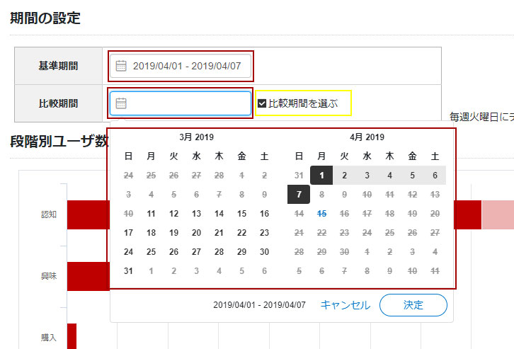 比較する場合は比較期間を選ぶにチェックを入れて期間を選択します。