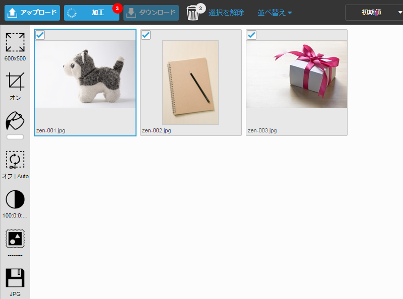 全ての画像にチェックを入れて、「加工」のボタンをクリックします。