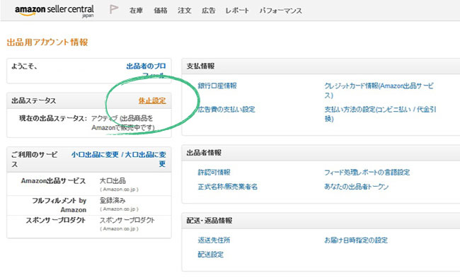 設定>出品用アカウント情報>出品ステータス>休止設定