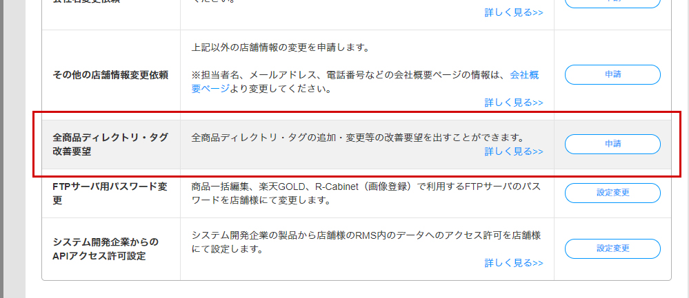 「拡張サービス一覧 > 各種申請・設定変更」のコーナーに「全商品ディレクトリ・タグ改善要望」