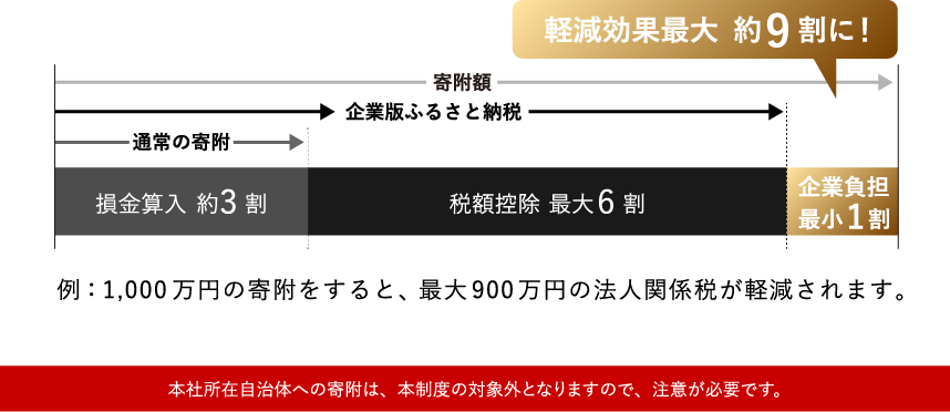 企業が自治体に寄附すると税務処理上の損金算入という扱いになります。損金算入の扱いになると、税金の軽減効果が一般的には3割ほど得られますので、その損金算入による約3割の軽減効果と、税額控除の約6割の部分を足すことで、最大約9割の軽減効果を得られます。「企業の負担が約1割になることがある」という点が2020年4月1日に行われた大幅な税制改正の一つのポイントで、企業版ふるさと納税が9割戻ると言われる理由です。